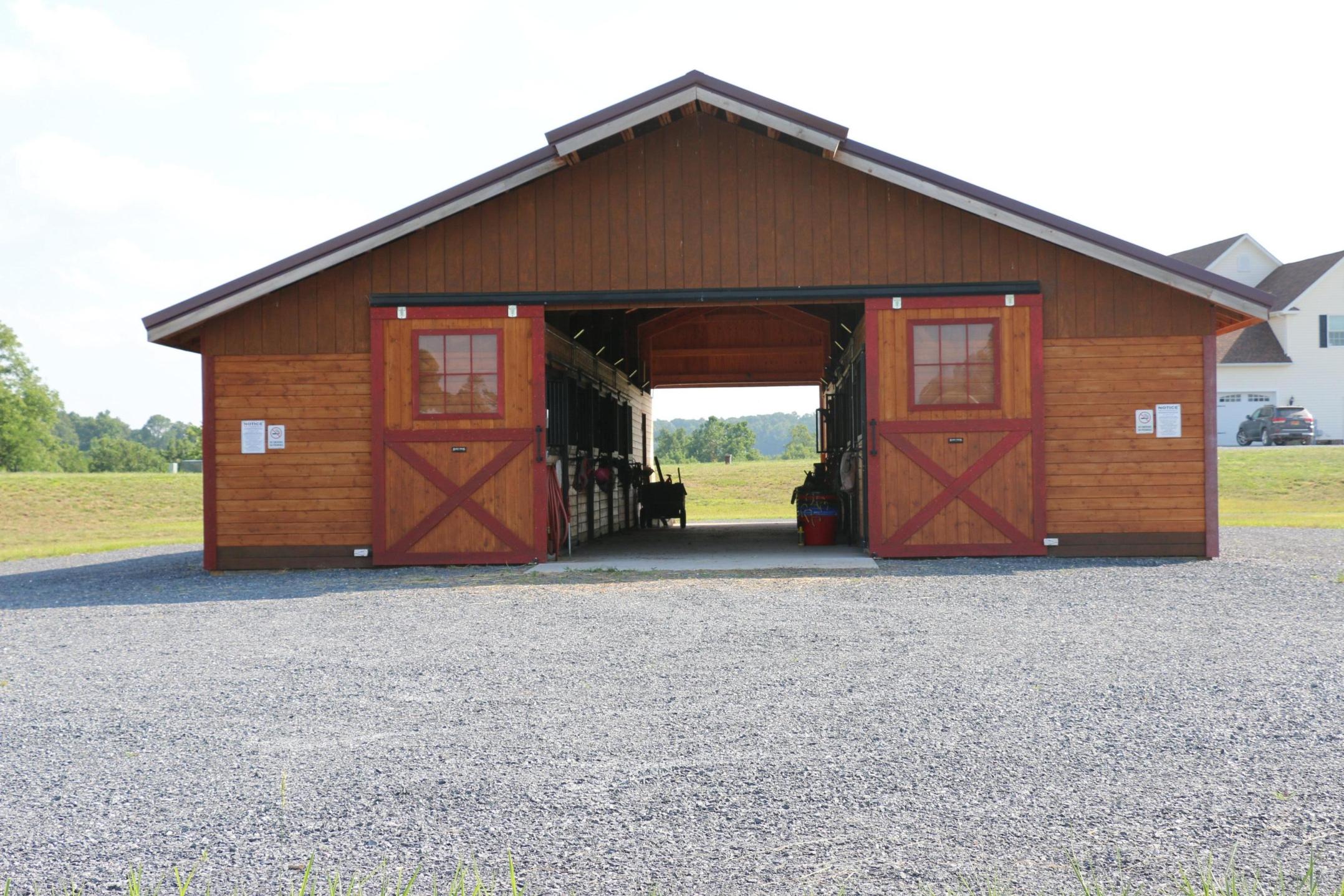 - 170’ x 90’ lighted outdoor arena with 4” base of stone dust topped with 2” of C33 sand, equipped with jumps and barrels.